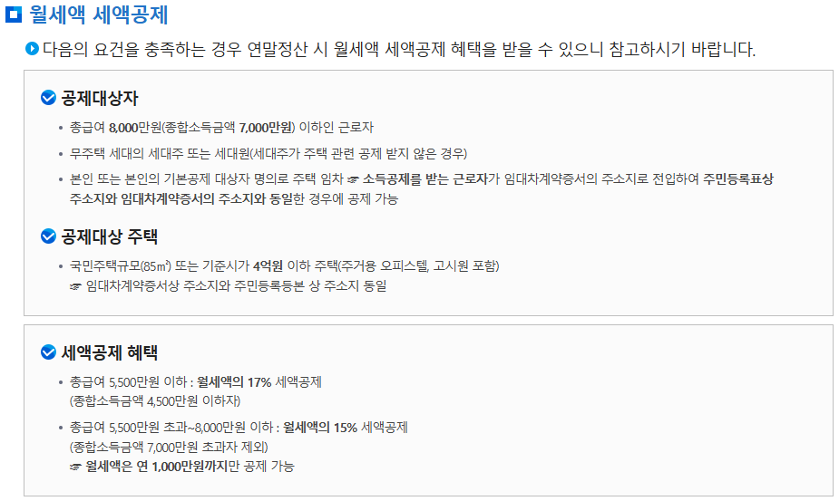 - 무주택 세대의 세대주 또는 세대원이 공제 대상입니다. (단, 세대주가 주택 공제 받지 않은 경우 세대원도 가능)