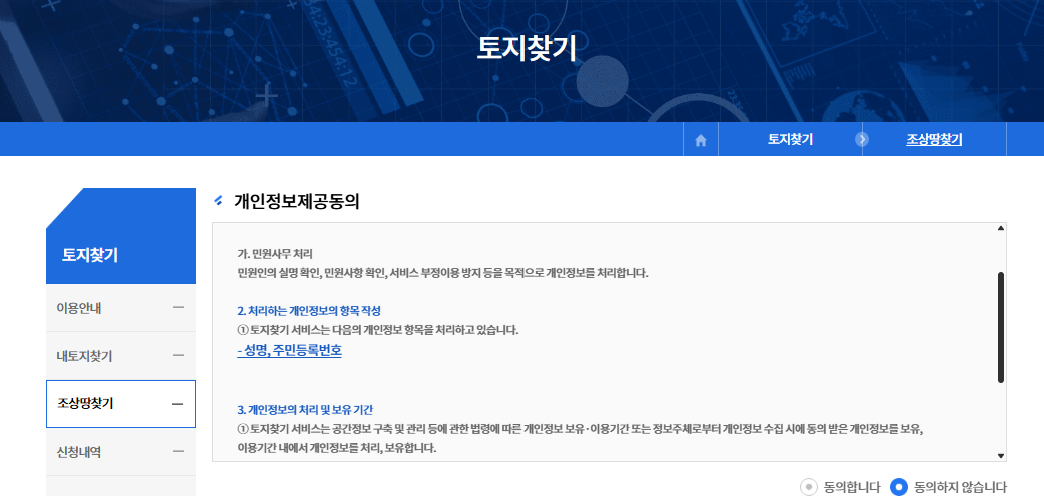 조상땅 찾기 서비스는 말 그대로 본인의 부모나 조부모, 혹은 직계 존속이 생전에 소유하고 있던 토지를 조회할 수 있습니다.