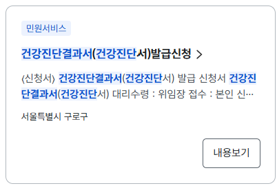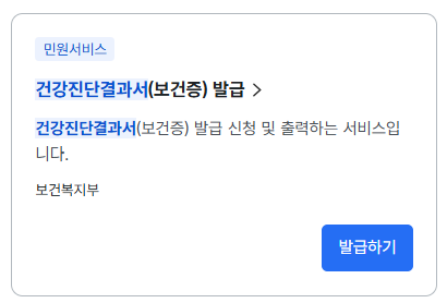 접속 후 검색창에 ‘건강진단결과서’ 입력 → 서비스 목록에서 ‘건강진단결과서 발급’ 클릭