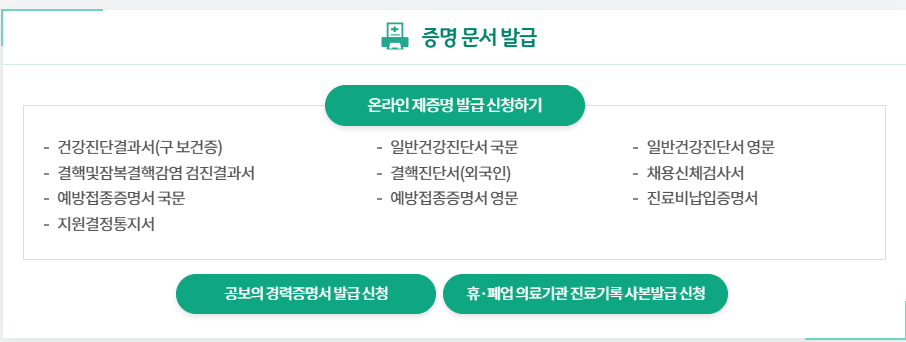 보건복지부와 한국사회보장정보원이 운영하는 온라인민원 서비스,건강진단결과서(구 보건증) 등 제증명 발급, 의료비지원 등 안내