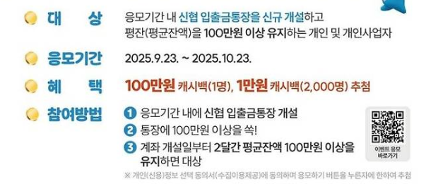 신협은 9월 23일부터 신규 계좌 개설 고객을 대상으로 2개월 평균 잔액 100만 원 이상을 유지하면 응모할 기회를 주는 이벤트를 전개하고 있습니다. 이 이벤트에서는 1명에게 100만 원, 2,000명에게 1만 원을 캐시백으로 지급합니다.