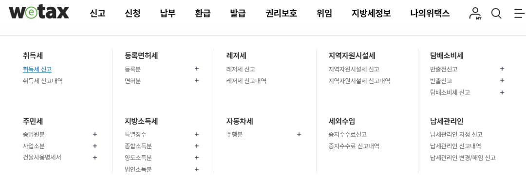 ② 상단 메뉴 ‘지방세 신고납부 → 취득세’ 선택
