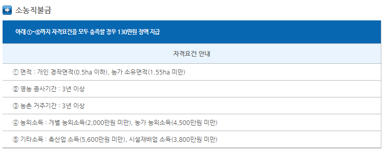 ● 대상: 경작면적 0.5ha 이하의 소규모 농가로, 일정 소득 및 농지 요건 충족 필요