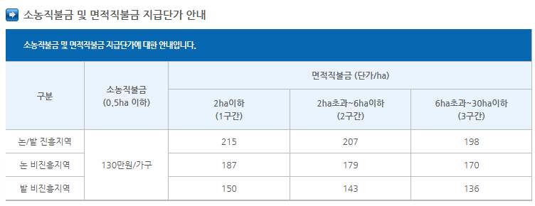 ● 특징: 면적과 관계없이 동일 금액을 지원받을 수 있어 영세농 보호 효과가 큼