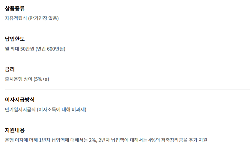 만약 최근 3년 중 한 번이라도 금융소득종합과세 대상자에 포함된 적이 있다면 가입이 제한됩니다. 매월 최대 50만 원까지 자유롭게 적립할 수 있고, 만기는 2년으로 설정되어 있습니다.