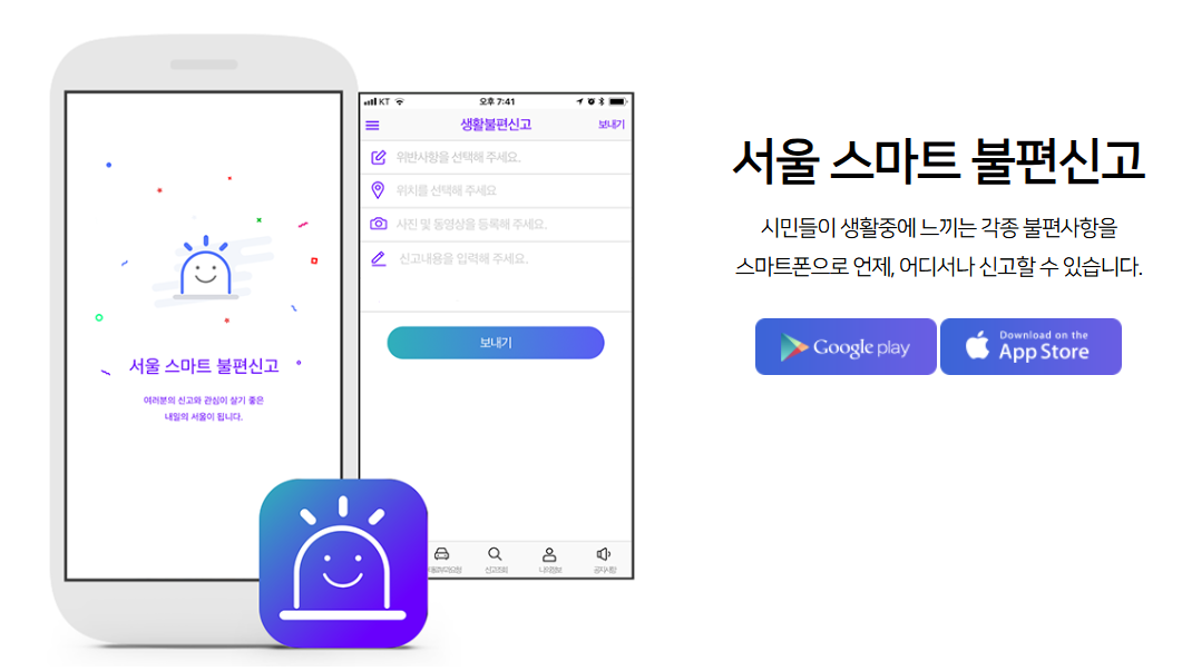 '서울스마트불편신고’ 앱을 이용하여 시민들께서 생활중에 느끼는 각종 불편사항을 스마트폰으로 언제, 어디서나 신고하실 수 있습니다.