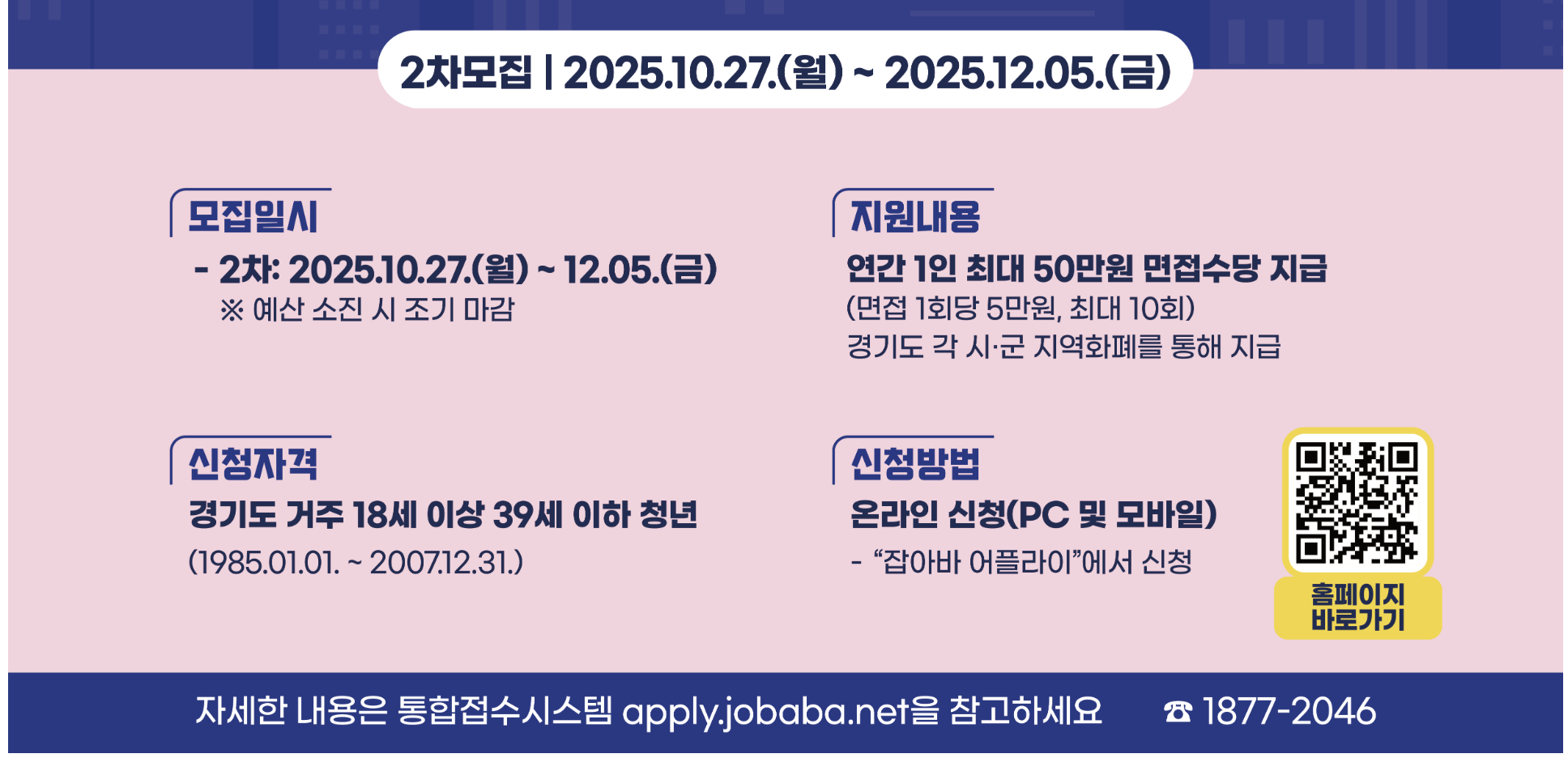 이번 청년면접수당 2차 모집은 2025년 10월 27일부터 12월 5일까지 진행됩니다. 신청은 온라인을 통해 간편하게 할 수 있습니다.