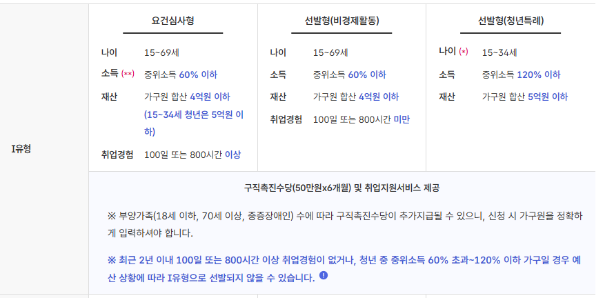 1유형: 소득과 자산이 일정 기준 이하이면서 취업 취약계층에 속하는 사람으로, 구직촉진수당(현금 지원)을 받을 수 있습니다.