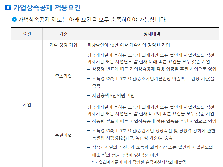 ● 가업 인정 요건: 동일 업종으로 10년 이상 영업활동을 지속해야 하며, 복수 업종을 운영 중인 경우 매출 비중이 가장 큰 주업종이 기준이 됩니다. 단, 부동산임대업, 주점업, 학원업 등은 제외되며, 관광호텔업은 예외적으로 인정됩니다.