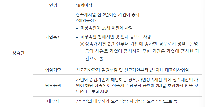 상속인은 18세 이상이어야 하며, 상속 개시일 2년 전부터 가업에 종사해야 합니다.