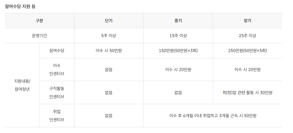 프로그램을 끝까지 참여하고 이수 기준을 충족하면 참여 수당이나 인센티브가 지급됩니다. 예컨대 단기형 프로그램의 경우 약 5주 동안 이수 시 50만원 수당이 지급되는 사례가 있습니다.