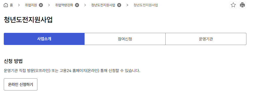 대표적인 경로는 고용24 홈페이지입니다. ‘취업지원 → 취업역량 강화 → 청년도전지원사업’ 메뉴를 통해 신청할 수 있습니다.