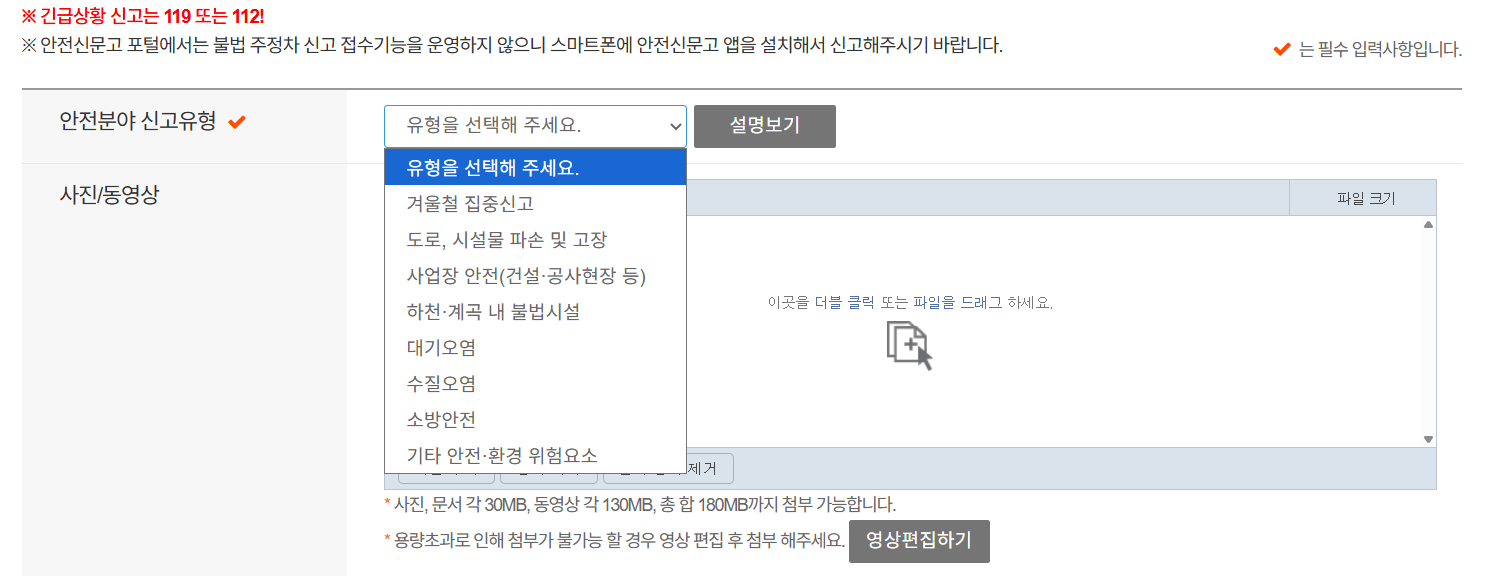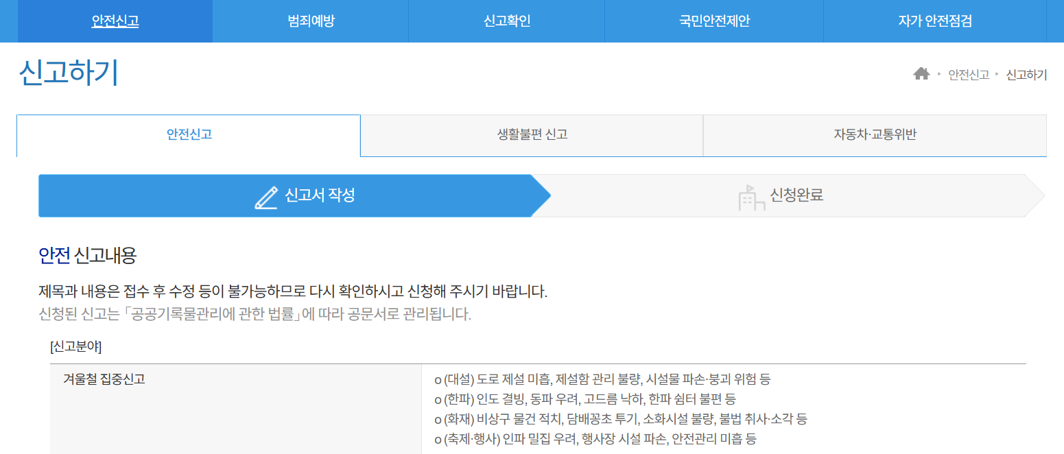 재난 또는 그 밖의 사고·위험으로부터 국민의 안전을 확보하기 위하여 안전위험 상황을 행정기관 등에 신고하는 행위입니다.