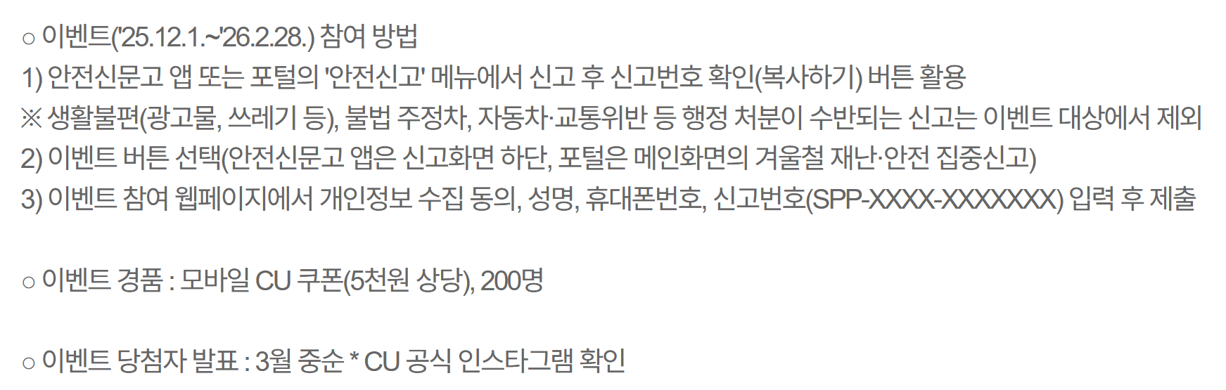 이번 겨울, 여러분의 작은 관찰과 행동이 누군가의 생명을 지킬 수 있습니다. 우리 주변을 안전하게 바꿀 수 있는 힘은 결코 거창한 것이 아닙니다. 안전신문고를 통해 확인되는 시민의 목소리가 우리 사회를 더욱 따뜻하고 든든하게 만들어 줄 것입니다.