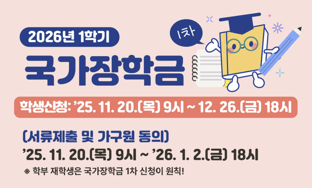 2025년 11월 20일 오전 9시부터 2025년 12월 26일 오후 6시까지 2026학년도 1학기 1차 국가장학금 신청이 진행됩니다.