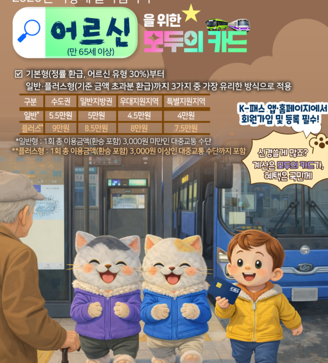 이번 개편에서 가장 눈에 띄는 변화 중 하나는 어르신 대상 혜택 강화입니다. 만 65세 이상 이용자의 경우 기존보다 높은 비율로 교통비 혜택이 적용되며, 이동이 잦은 고령층의 실질적인 부담을 줄이는 데 초점을 맞췄습니다.