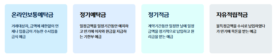 - 정기적금: 매월 일정 금액을 불입해 만기 시 목돈 마련