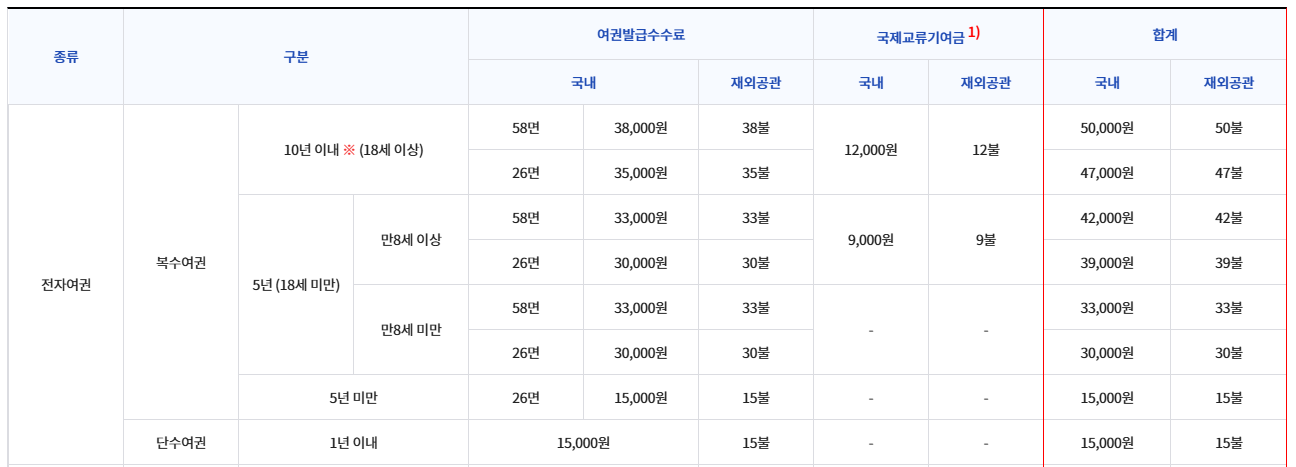 | 복수여권 | 5년 | 전자여권 | ○ | 45,000원 | 45미불 |
