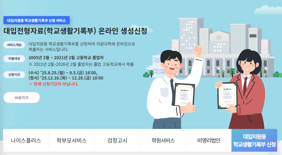 - 수시전형에서는 내신 성적뿐 아니라 교내 활동 기록, 봉사 시간 등이 평가 대상이 되므로 생활기록부 제출이 필수적입니다.