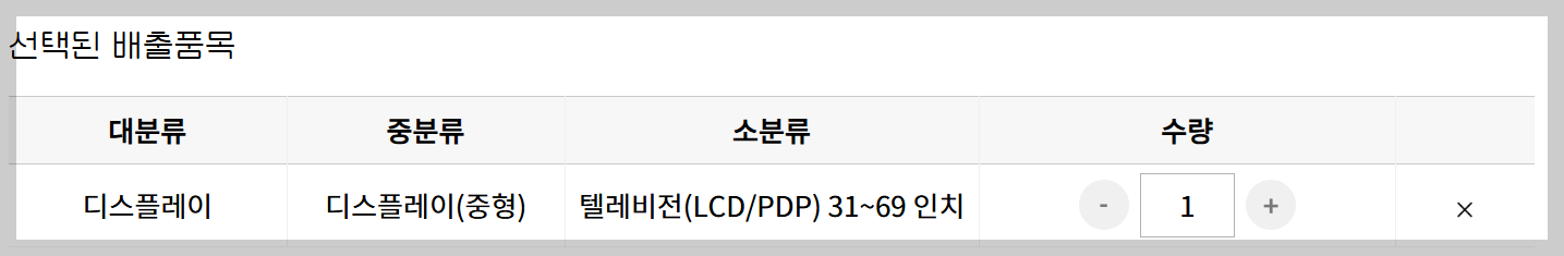 - 대형 가전 기준 : 냉장고, 세탁기, TV, 에어컨 등 기본적인 대형 제품