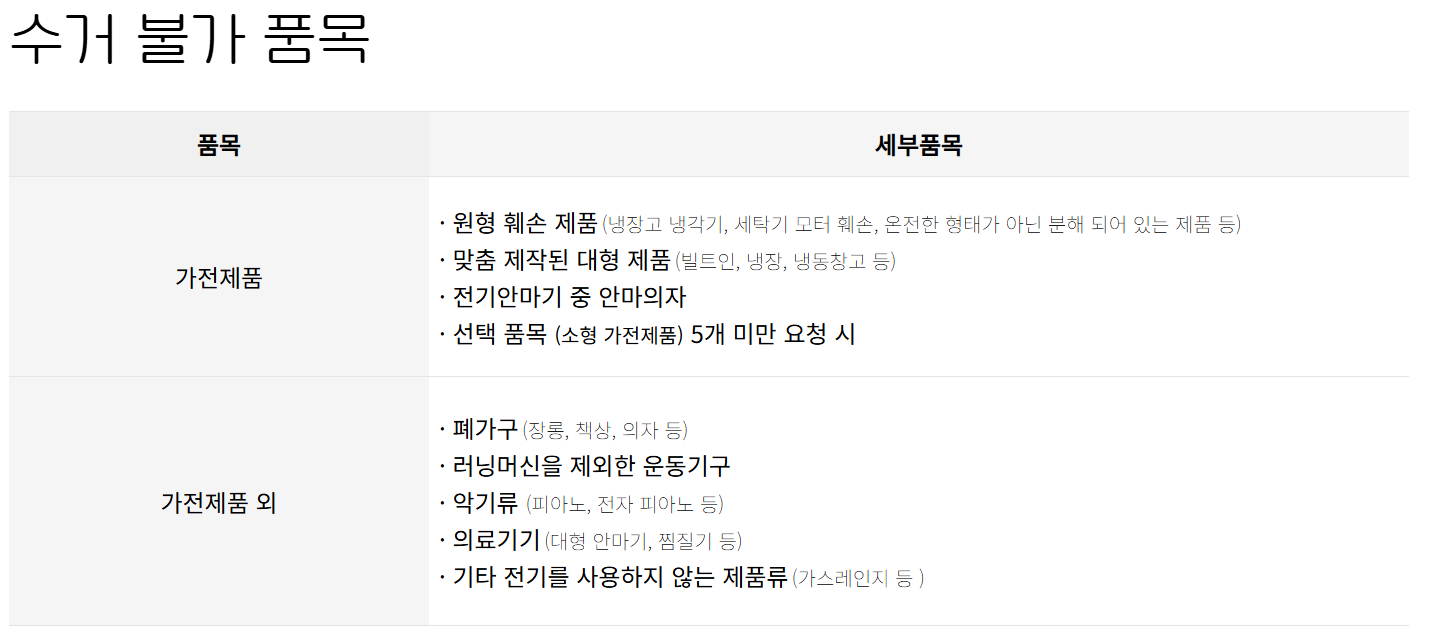 ● 특정제외 품목: 분해된 가전, 원형 훼손 제품, 빌트인 가전, 가구류, 피아노 등은 수거 불가