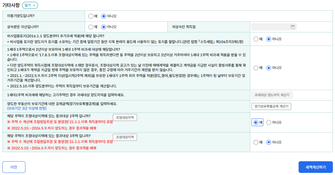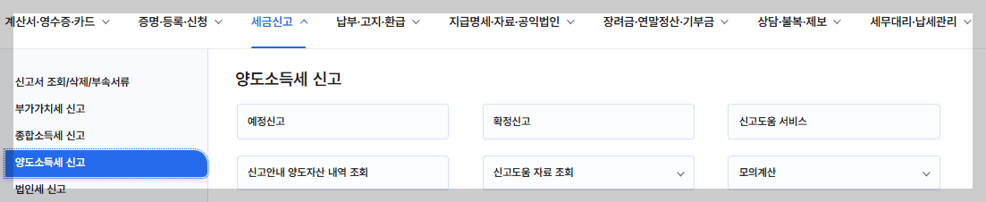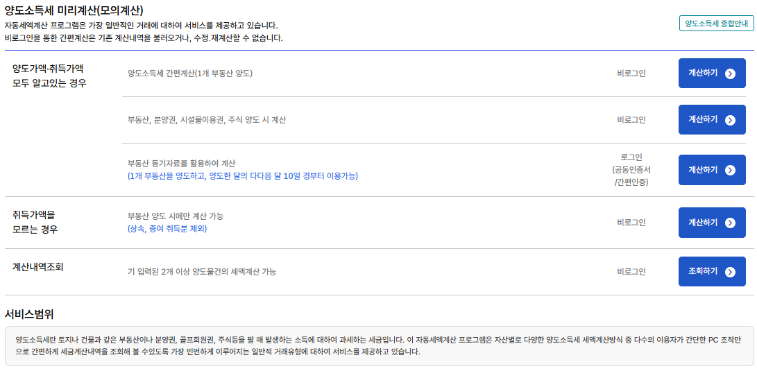 실제 내 상황을 점검하고 싶다면 국세청 홈페이지에서 양도소득세 모의 계산을 해 볼 수 있습니다.