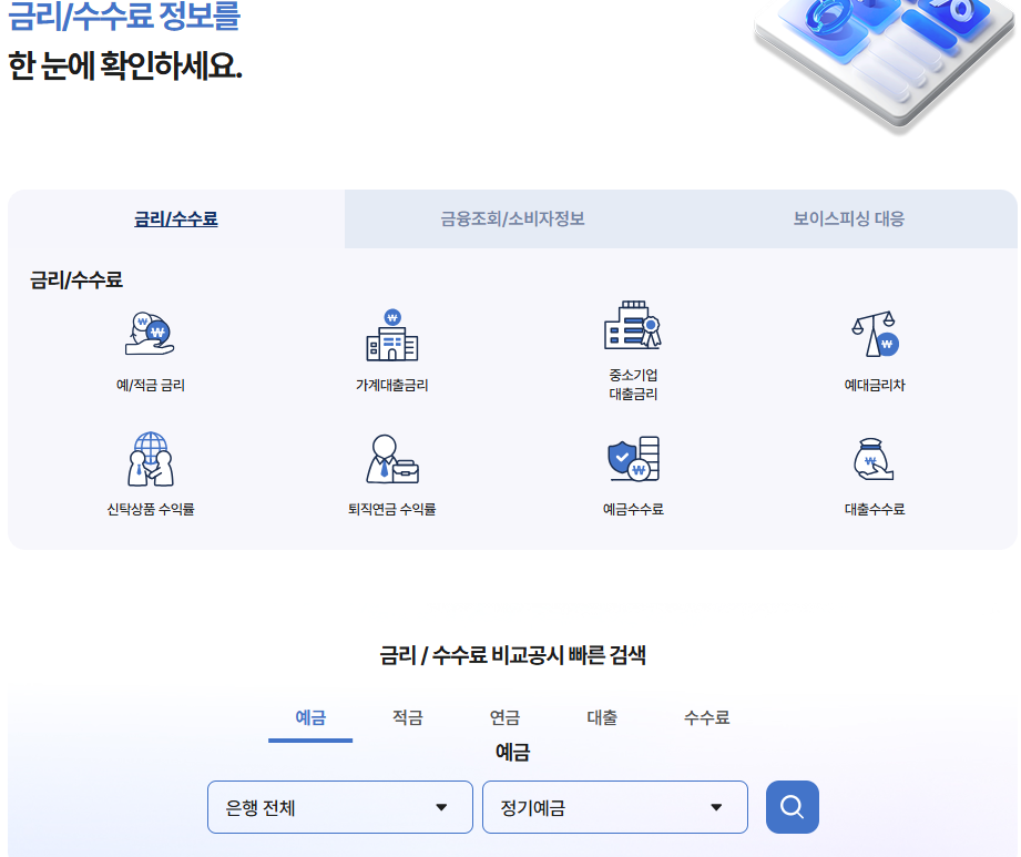 금융상품정보, 금리/수수료 비교공시, 금융서비스정보, 소비자정보, 금융교육, 보이스피싱정보